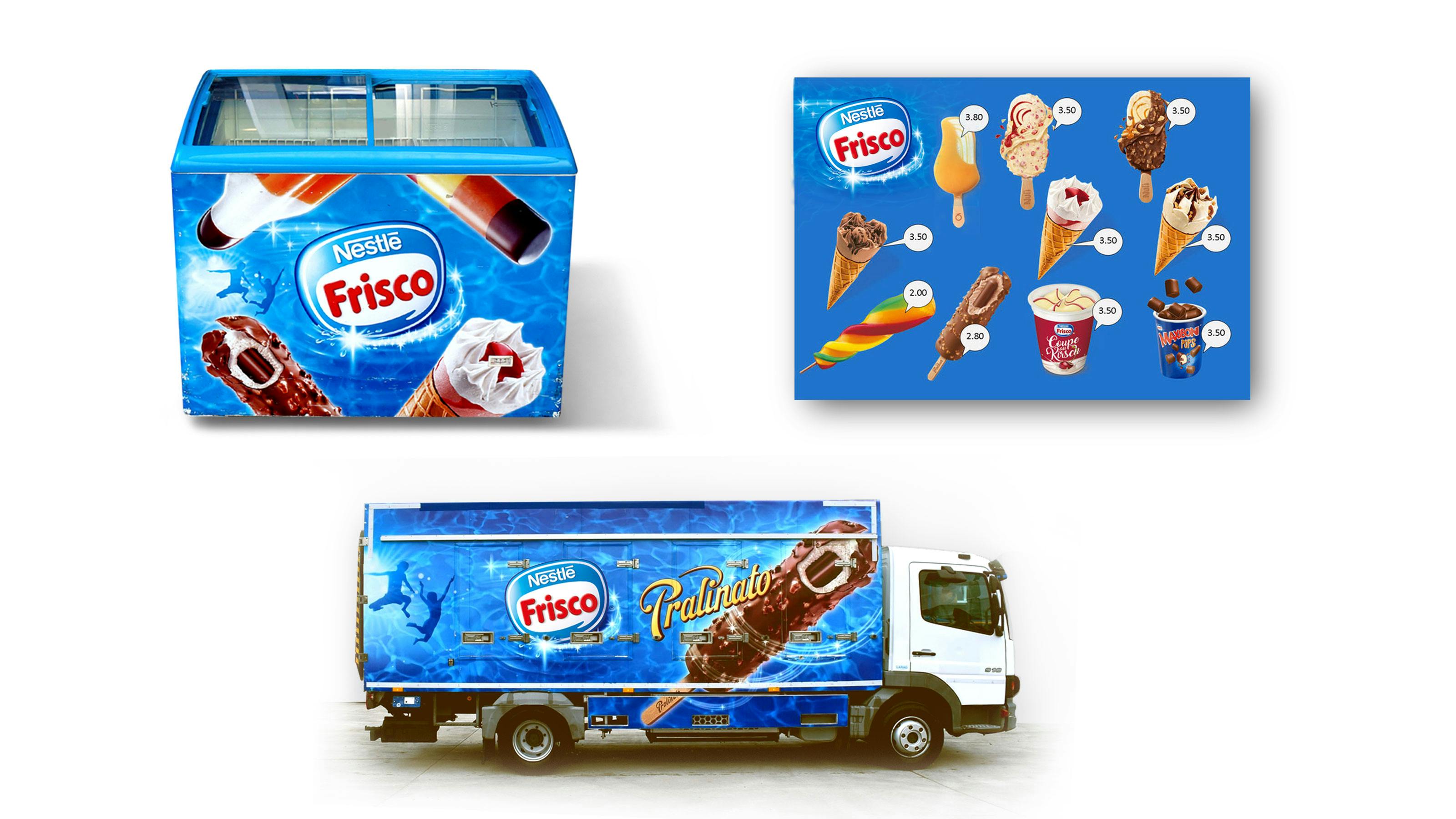 Allan Boyle von Nestlé vertraute uns die Entwicklung einer international verbindlichen visuellen Identität des Ice Cream Programms an. Das neue Logo soll für alle Märkte auf den fünf Kontinenten die gleiche, sofort erkennbare Identität bekommen. Auch die Integration des neuen Logos mit dem Nestlé-Swimming Pool Hintergrund für Plakate und Kühltruhen war Teil der Aufgabe.