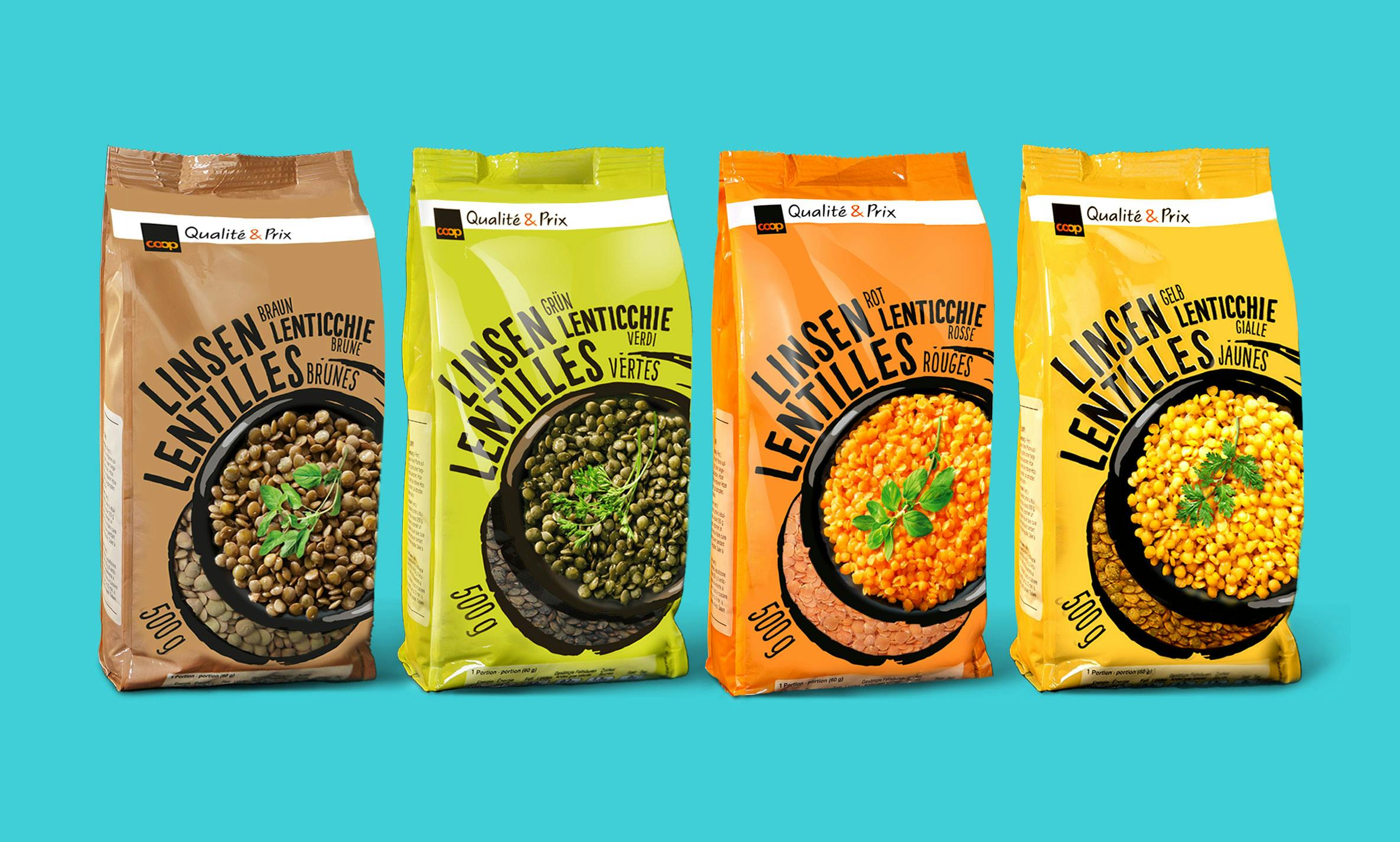 In der modernen und gesunden Ernährung, besonders in der veganen Küche, spielen die Hülsenfrüchte eine wichtige Rolle. Das farbige, moderne Design unterstützt den heutigen Trend zur vollwertigen Ernährung und wirkt animierend. Die Linsensorten werden schon durch die Beutelfarbe kommuniziert. Das Foto vom zubereiteten Produkt erhöht die Suggestivkraft und somit die Lust auf das Gericht. Anstelle des Schlagschattens vom Teller ist ein Sichtfenster auf das Naturprodukt.