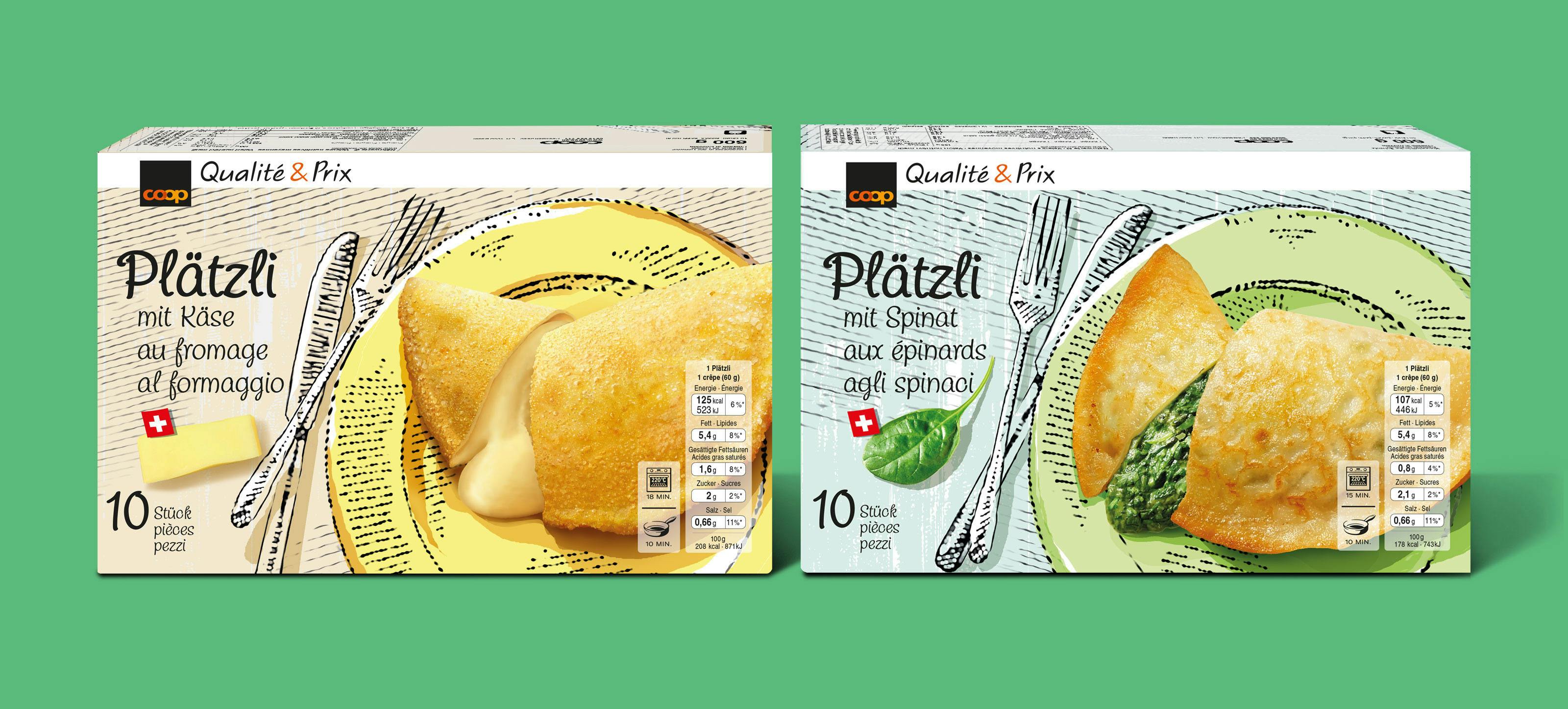 Für die Familie oder Singels wenn die Zeit knapp ist, die Pläzli sind schnell und unkompliziert zubereitet. Darauf haben wir das Design ausgerichtet. Die flüchtige Skizze vom Tisch, Teller und Besteck vermittelt das Spontane, Improvisierte. Das Foto vom zubereiteten Produkt sorgt für Appetite Appeal.